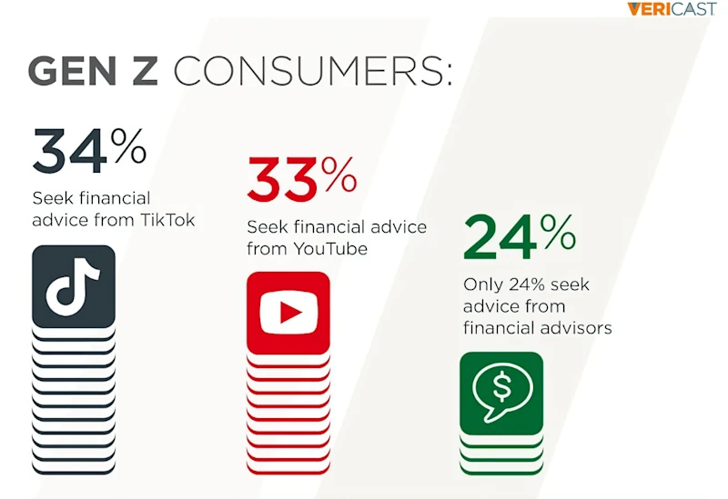 Over two-thirds of respondents identified TikTok and Youtube as their sources for financial guidance, and only 25% sought advice from traditional financial advisors and banks. (Source: Vericast, Consumers Seek Financial Guidance and Comfort from Non-Traditional Sources Like TikTok).