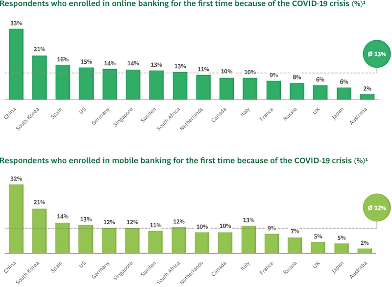In 16 key markets, 13% of respondents used online banking for the first time in 2020-2021, with 12% utilizing mobile banking services. Some markets reported even higher adoption rates.