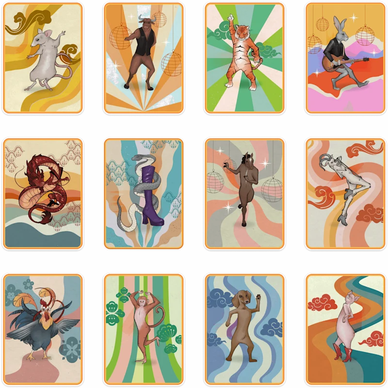 Structure was survival. Each of the twelve zodiac animals was hand-illustrated to represent famous funk and disco artists from the 70s. We built a modular character system where all animals shared the same underlying geometric structure—different textures and personalities, built from the same bones.